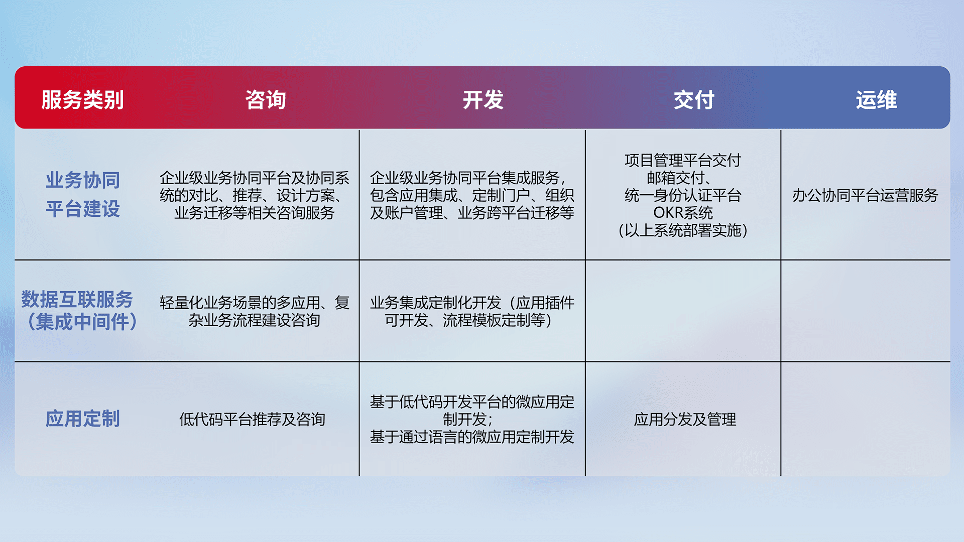 针对钉钉、、、、企微、、IDaas等平台级产品提供产品的规划、、方案、、、、交付、、、定制化开发等服务,,,,实现如统一协同办公、、智能客户服务、、、混合会议管理、、、、智能数据查询、、等业务场景,,,实现数字化转型。。